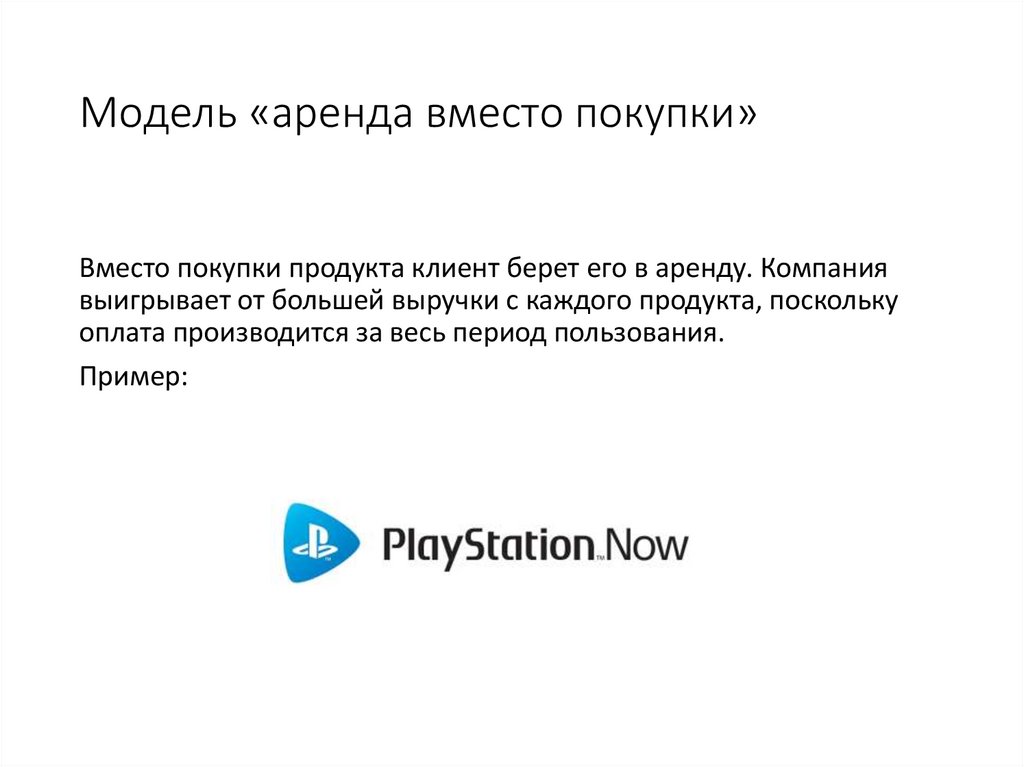 Модель «аренда вместо покупки»Вместо покупки продукта клиент берет его в аренду. Компания