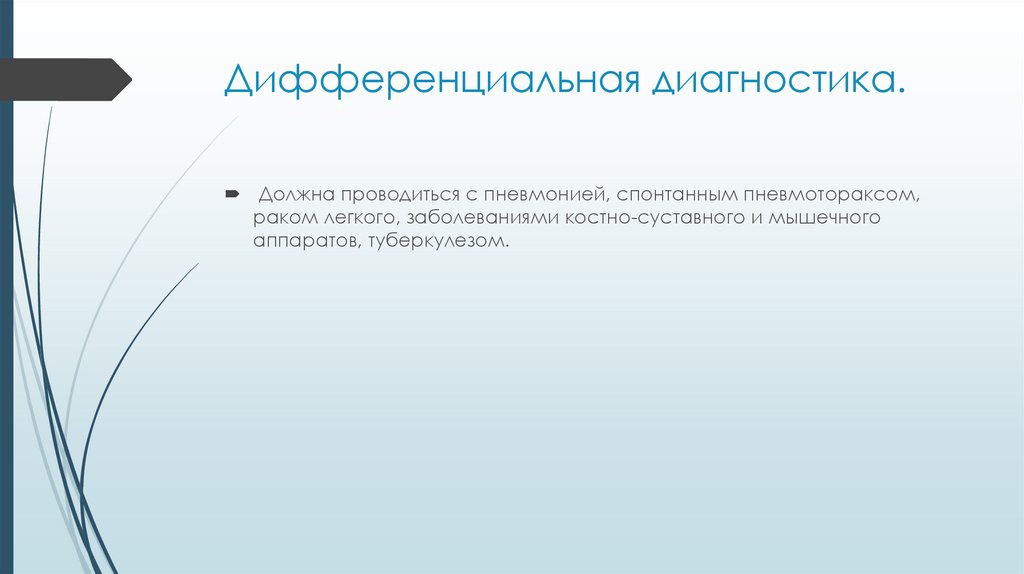 Дифференциальная диагностика.Должна проводиться с пневмонией, спонтанным пневмотораксом,