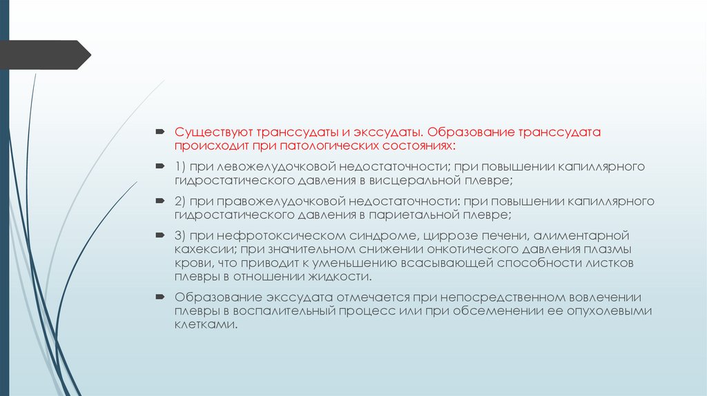 Существуют транссудаты и экссудаты. Образование транссудатапроисходит при патологических состояниях: