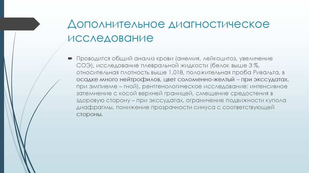 СОЭ), исследование плевральной жидкости (белок выше 3 %,