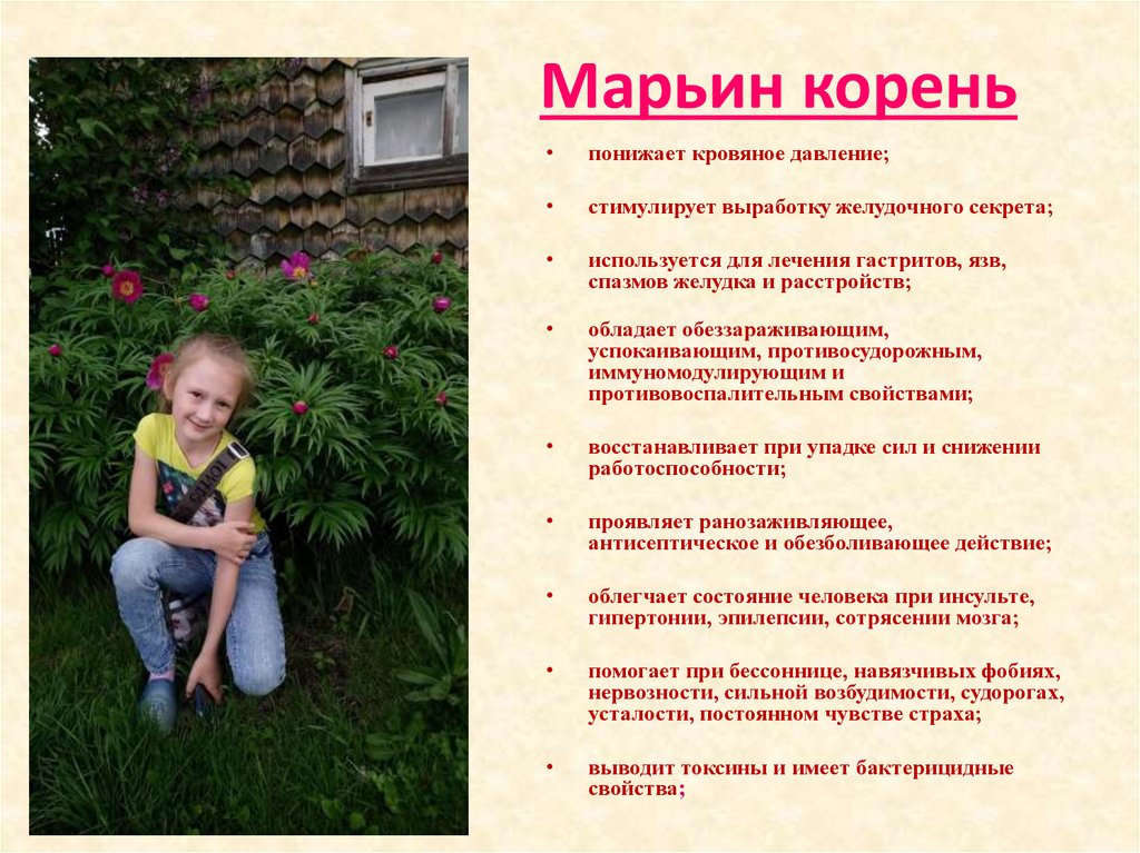 Марьин кореньпонижает кровяное давление;