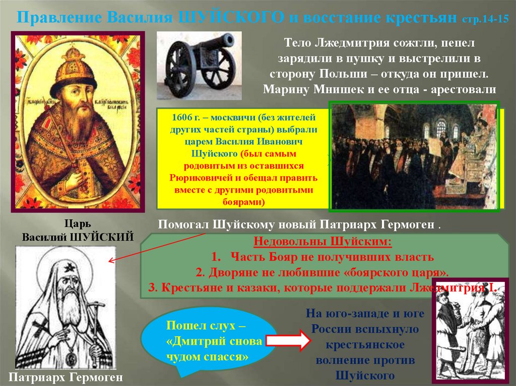 Правление Василия ШУЙСКОГО и восстание крестьян стр.14-15Тело Лжедмитрия сожгли, пепел
