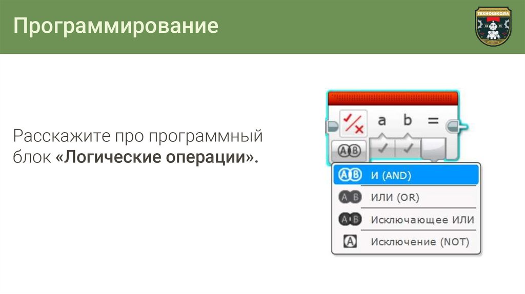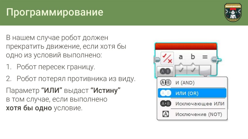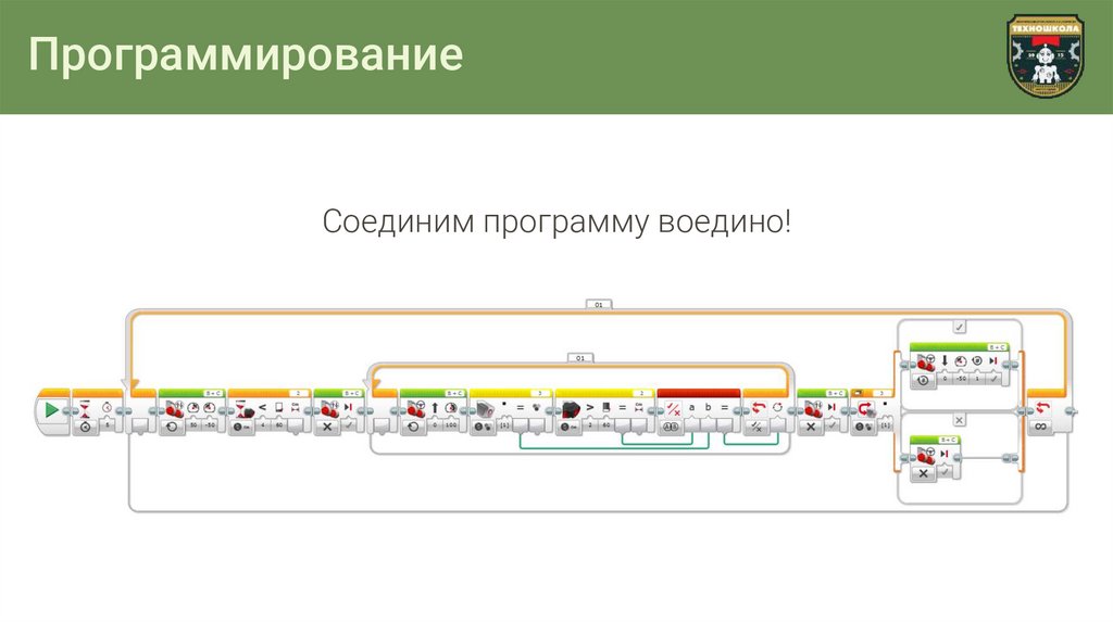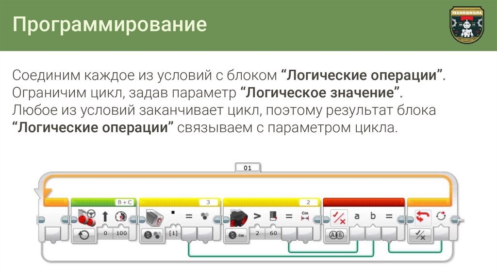ПрограммированиеСоединим каждое из условий с блоком “Логические операции”.