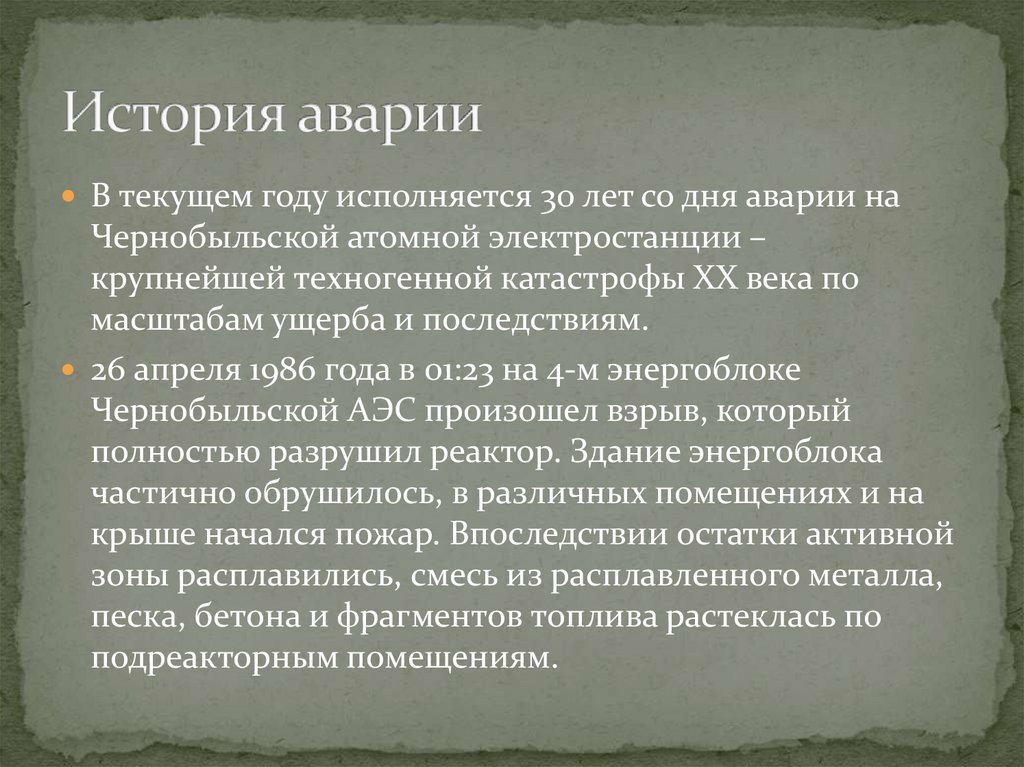 В текущем году исполняется 30 лет со дня аварии наЧернобыльской атомной электростанции –