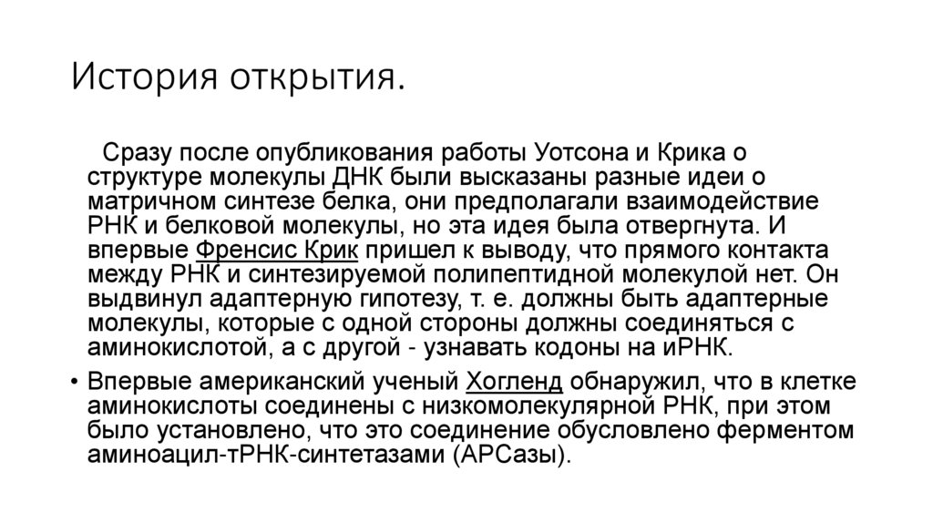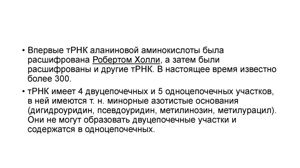 • Впервые тРНК аланиновой аминокислоты быларасшифрована Робертом Холли, а затем были