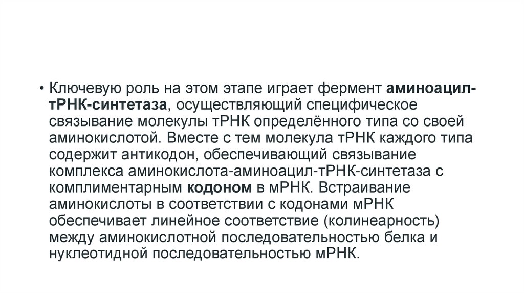 • Ключевую роль на этом этапе играет фермент аминоацилтРНК-синтетаза, осуществляющий специфическоесвязывание молекулы тРНК определённого типа со своей
