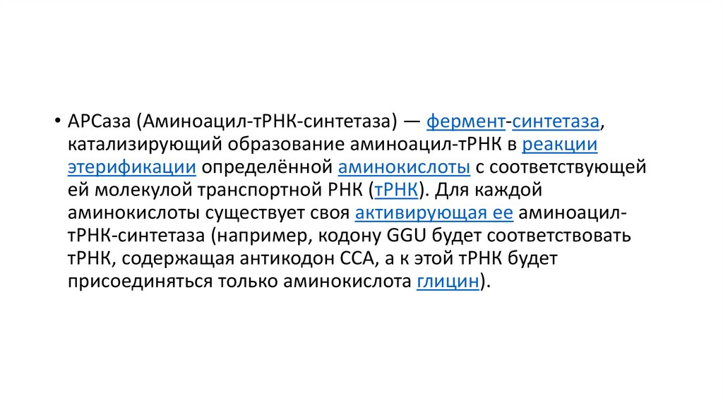 • АРСаза (Аминоацил-тРНК-синтетаза) — фермент-синтетаза,катализирующий образование аминоацил-тРНК в реакции