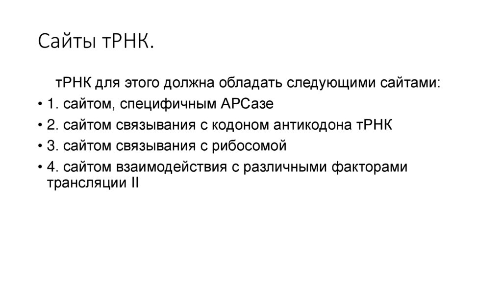 Сайты тРНК.• +тРНК для этого должна обладать следующими сайтами: