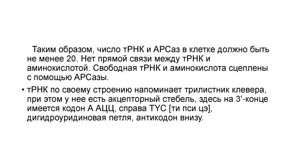 • +Таким образом, число тРНК и АРСаз в клетке должно бытьне менее 20. Нет прямой связи между тРНК и