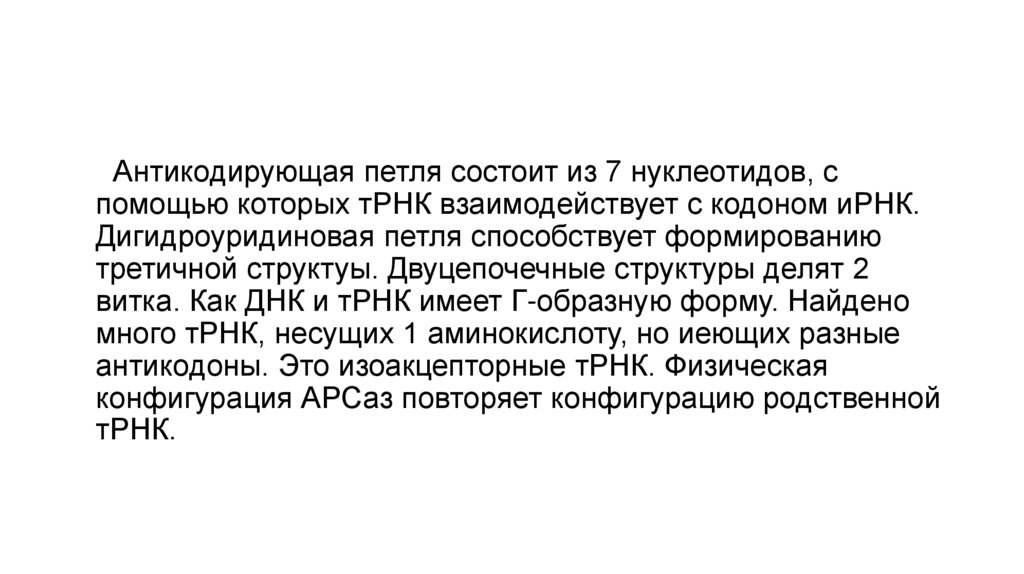 • +Антикодирующая петля состоит из 7 нуклеотидов, спомощью которых тРНК взаимодействует с кодоном иРНК.