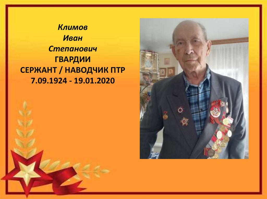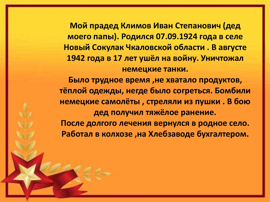 Мой прадед Климов Иван Степанович (дедмоего папы). Родился 07.09.1924 года в селе