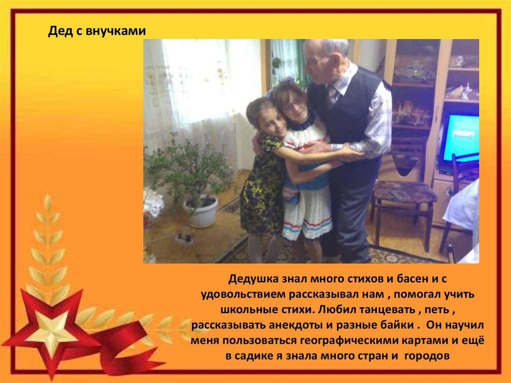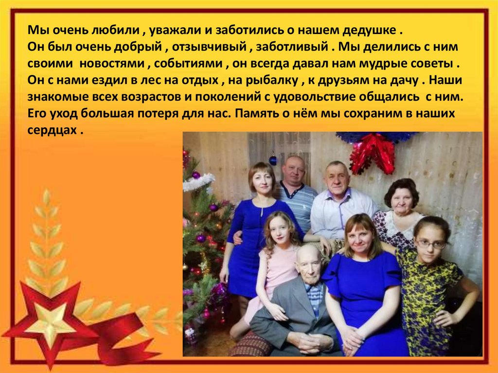 Мы очень любили , уважали и заботились о нашем дедушке .Он был очень добрый , отзывчивый , заботливый . Мы делились с ним