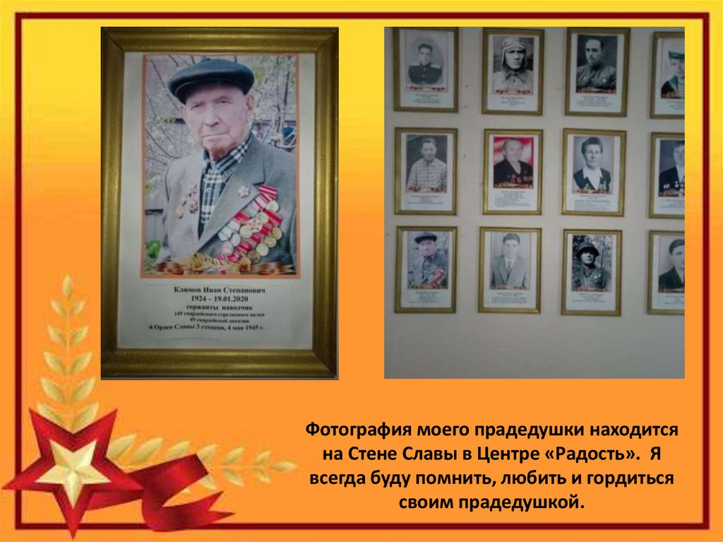 Фотография моего прадедушки находитсяна Стене Славы в Центре «Радость». Я