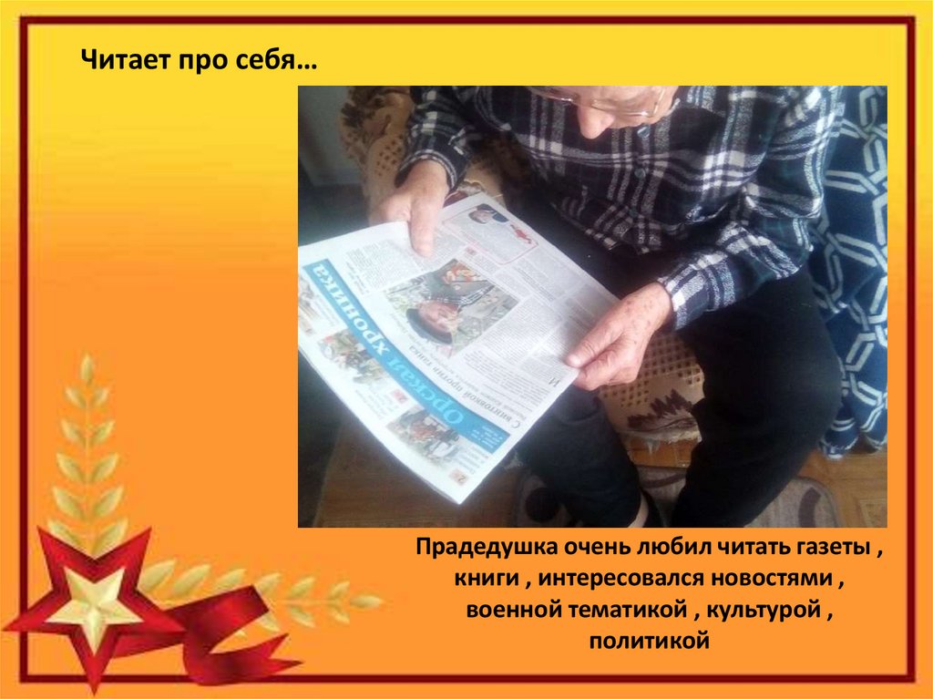 Читает про себя…Прадедушка очень любил читать газеты ,