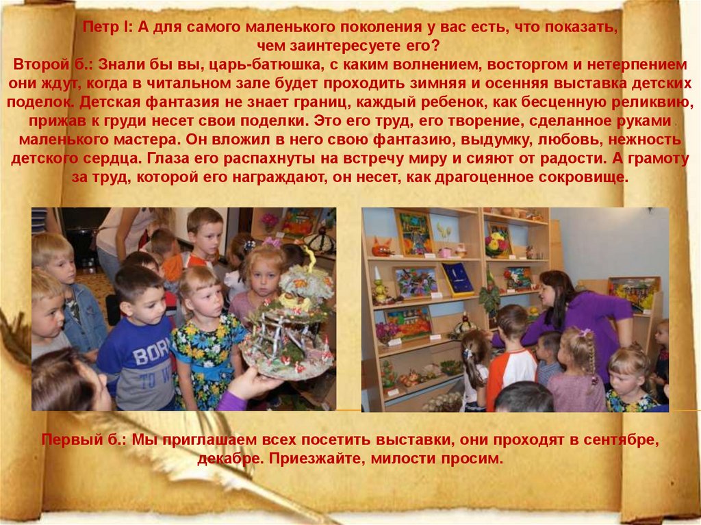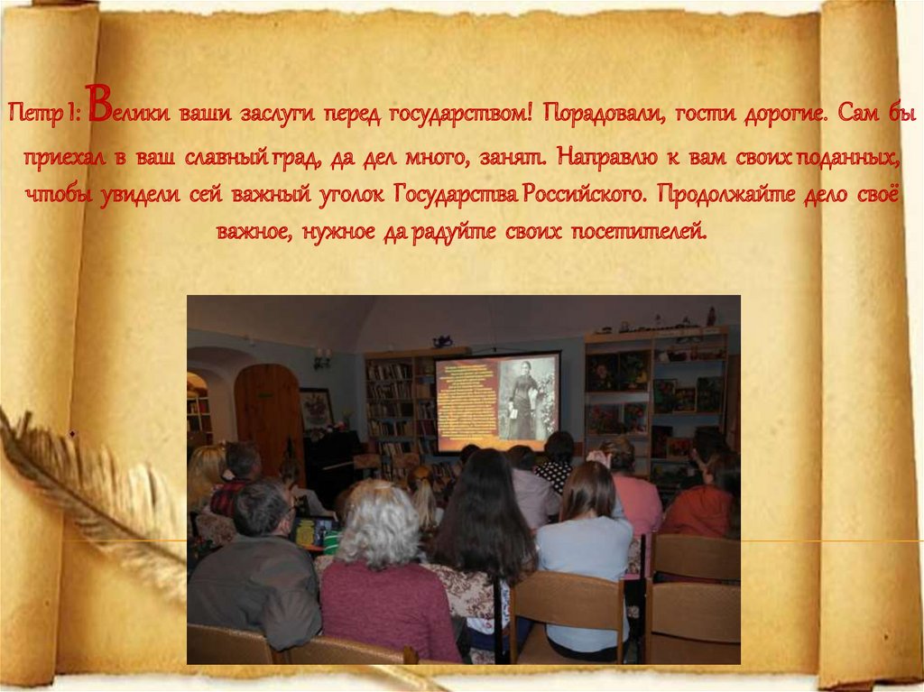 Библиотекари: Добрый день, государь-батюшка.Петр I: С чем пожаловали гости дорогие?