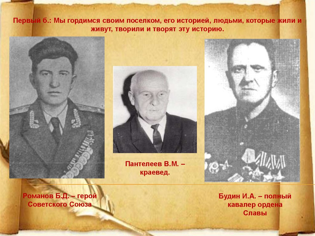 Первый б.: Мы гордимся своим поселком, его историей, людьми, которые жили иживут, творили и творят эту историю.
