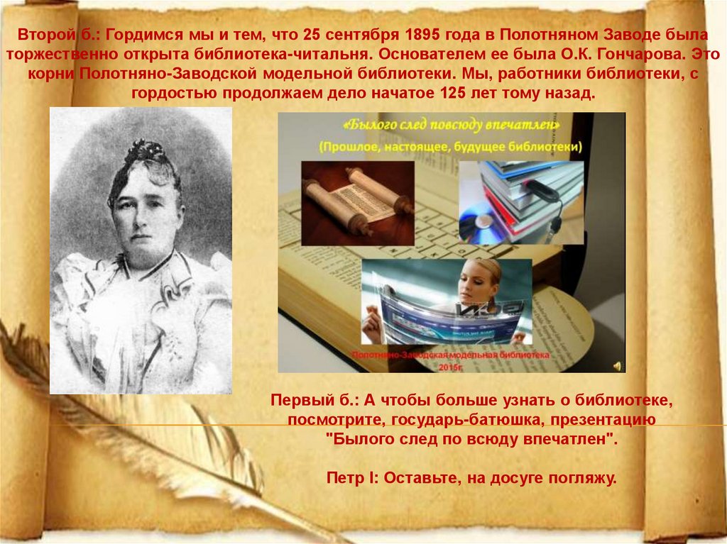 Второй б.: Гордимся мы и тем, что 25 сентября 1895 года в Полотняном Заводе былаторжественно открыта библиотека-читальня. Основателем ее была О.К. Гончарова. Это
