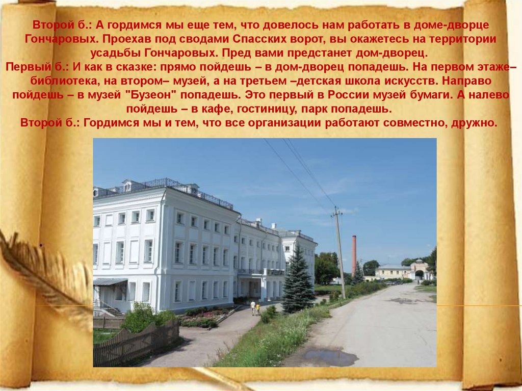 Второй б.: А гордимся мы еще тем, что довелось нам работать в доме-дворцеГончаровых. Проехав под сводами Спасских ворот, вы окажетесь на территории
