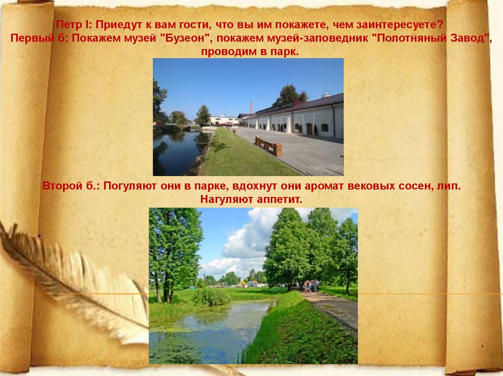 Петр I: Приедут к вам гости, что вы им покажете, чем заинтересуете?Первый б: Покажем музей "Бузеон", покажем музей-заповедник "Полотняный Завод",