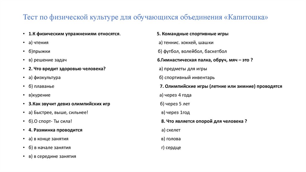 Тест по физической культуре для обучающихся объединения «Капитошка»