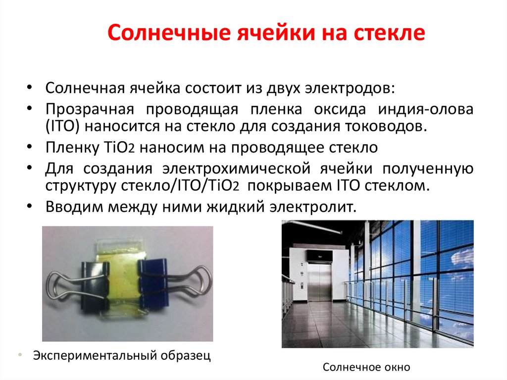 Солнечные ячейки на стекле• Солнечная ячейка состоит из двух электродов: