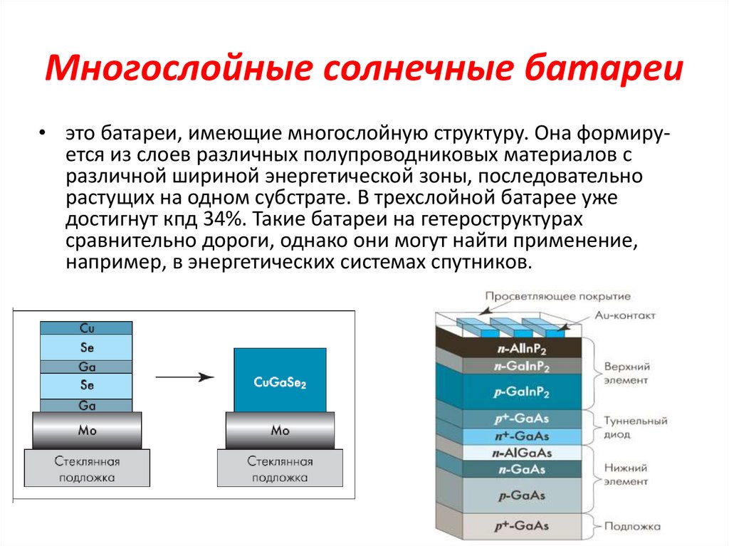 Многослойные солнечные батареи• это батареи, имеющие многослойную структуру. Она формируется из слоев различных полупроводниковых материалов с