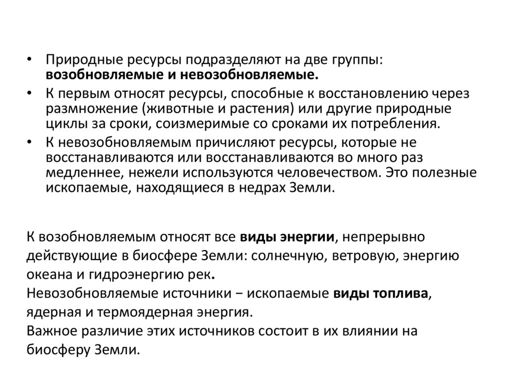 • Природные ресурсы подразделяют на две группы:возобновляемые и невозобновляемые.