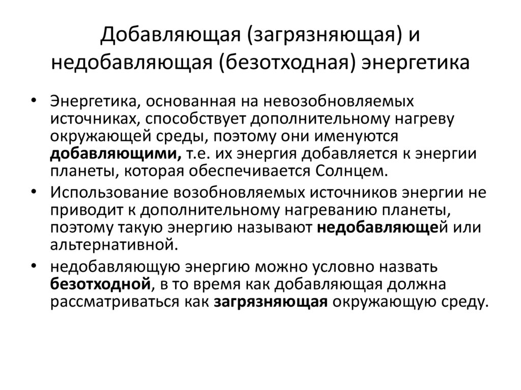 Добавляющая (загрязняющая) инедобавляющая (безотходная) энергетика