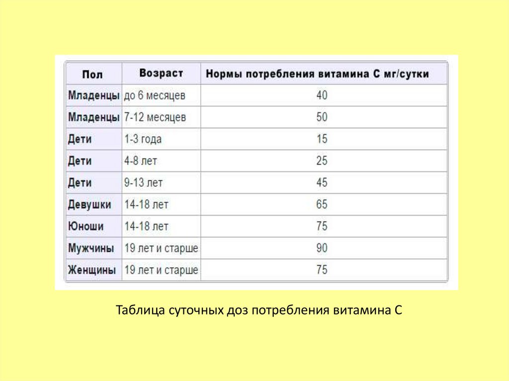 Таблица суточных доз потребления витамина С4.