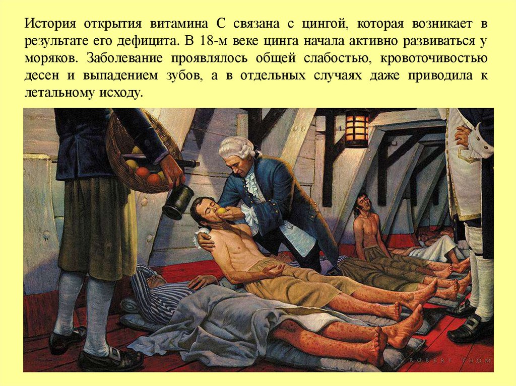 История открытия витамина С связана с цингой, которая возникает врезультате его дефицита. В 18-м веке цинга начала активно развиваться у