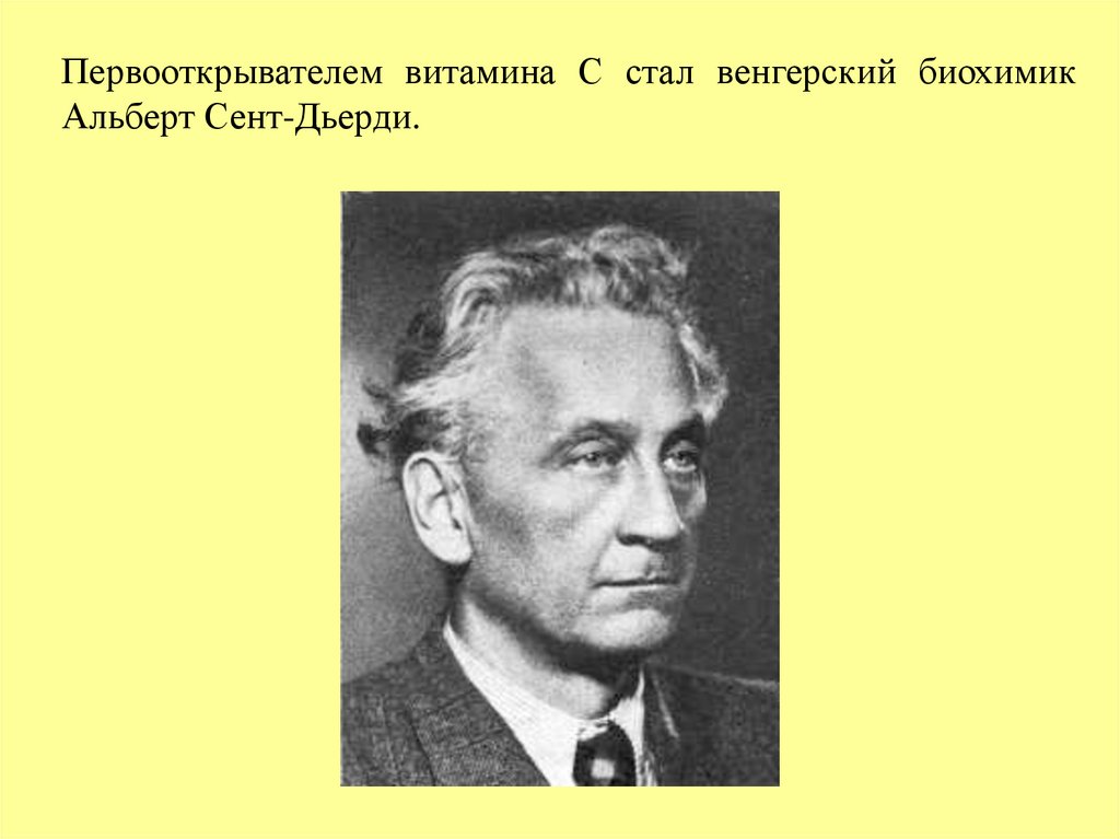 Первооткрывателем витамина С стал венгерский биохимикАльберт Сент-Дьерди.