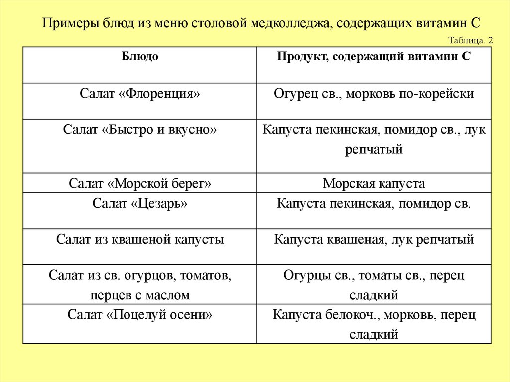 Примеры блюд из меню столовой медколледжа, содержащих витамин СТаблица. 2