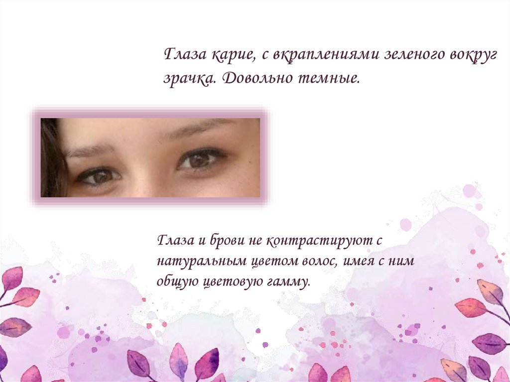 Глаза карие, с вкраплениями зеленого вокругзрачка. Довольно темные.