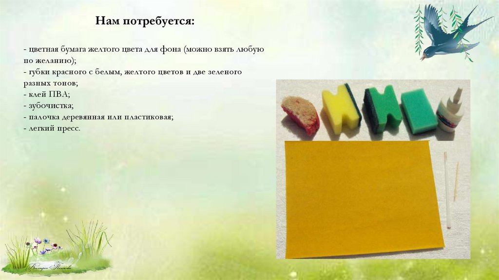 Нам потребуется:- цветная бумага желтого цвета для фона (можно взять любую