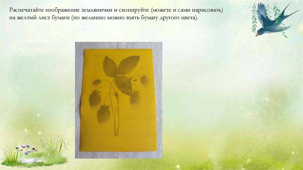 Распечатайте изображение землянички и скопируйте (можете и сами нарисовать)на желтый лист бумаги (по желанию можно взять бумагу другого цвета).