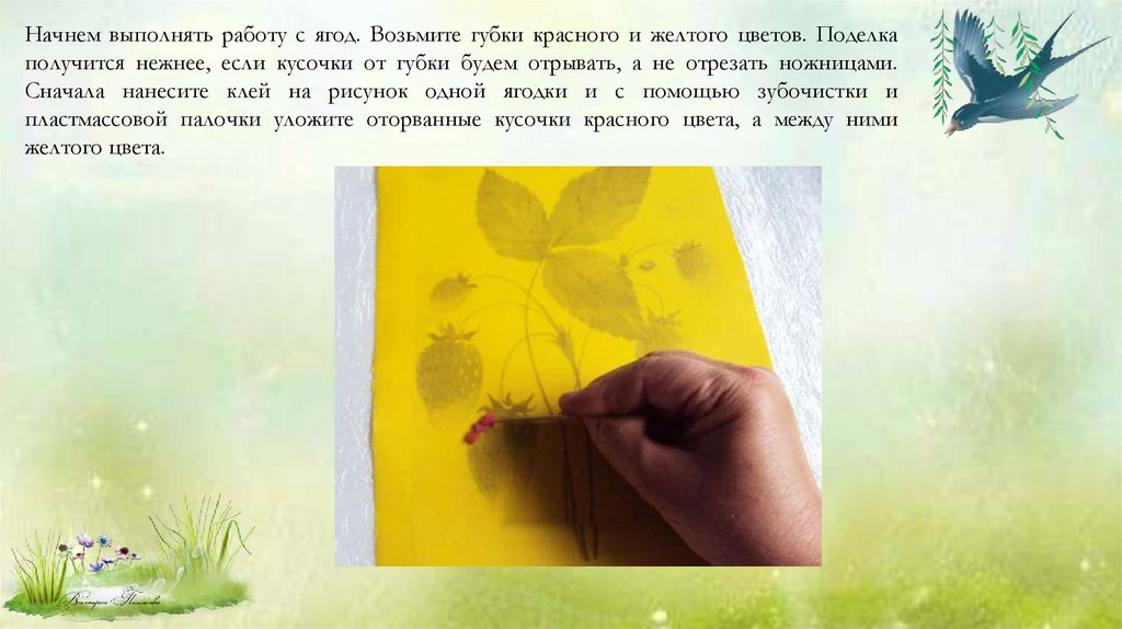 Начнем выполнять работу с ягод. Возьмите губки красного и желтого цветов. Поделкаполучится нежнее, если кусочки от губки будем отрывать, а не отрезать ножницами.