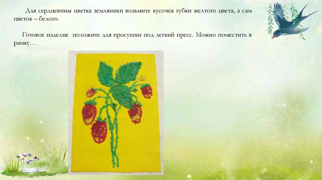 Потом положите под пресс, так как губка от клея набухает. Затем поочереднопродолжите заполнять рисунок всех ягод земляники.