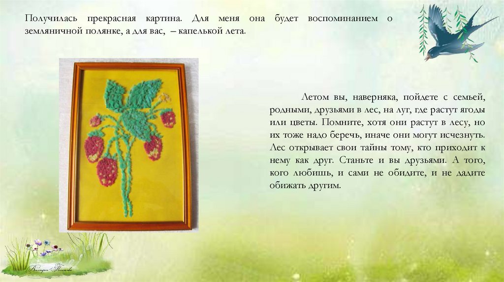 Получилась прекрасная картина. Для меня она будет воспоминанием оземляничной полянке, а для вас, – капелькой лета.