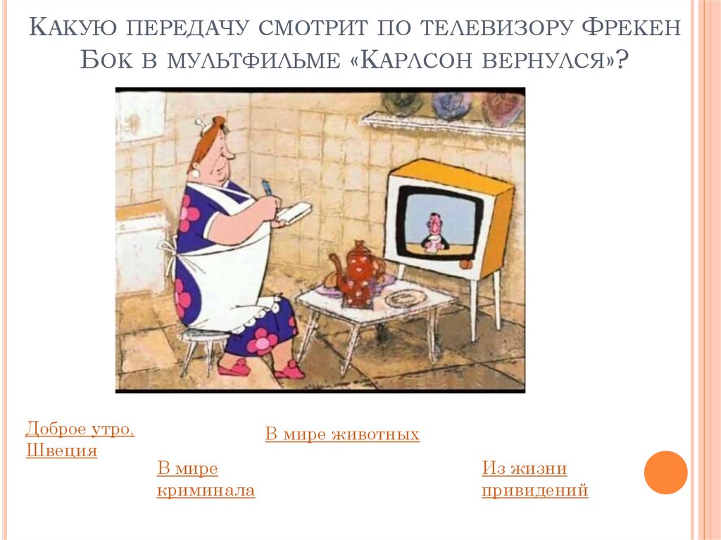 КАКУЮ ПЕРЕДАЧУ СМОТРИТ ПО ТЕЛЕВИЗОРУ ФРЕКЕНБОК В МУЛЬТФИЛЬМЕ «КАРЛСОН ВЕРНУЛСЯ»?
