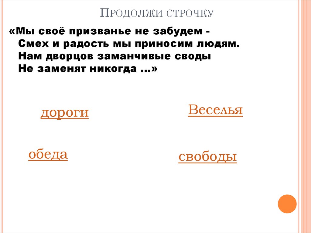 ПРОДОЛЖИ СТРОЧКУ«Мы своё призванье не забудем Смех и радость мы приносим людям.