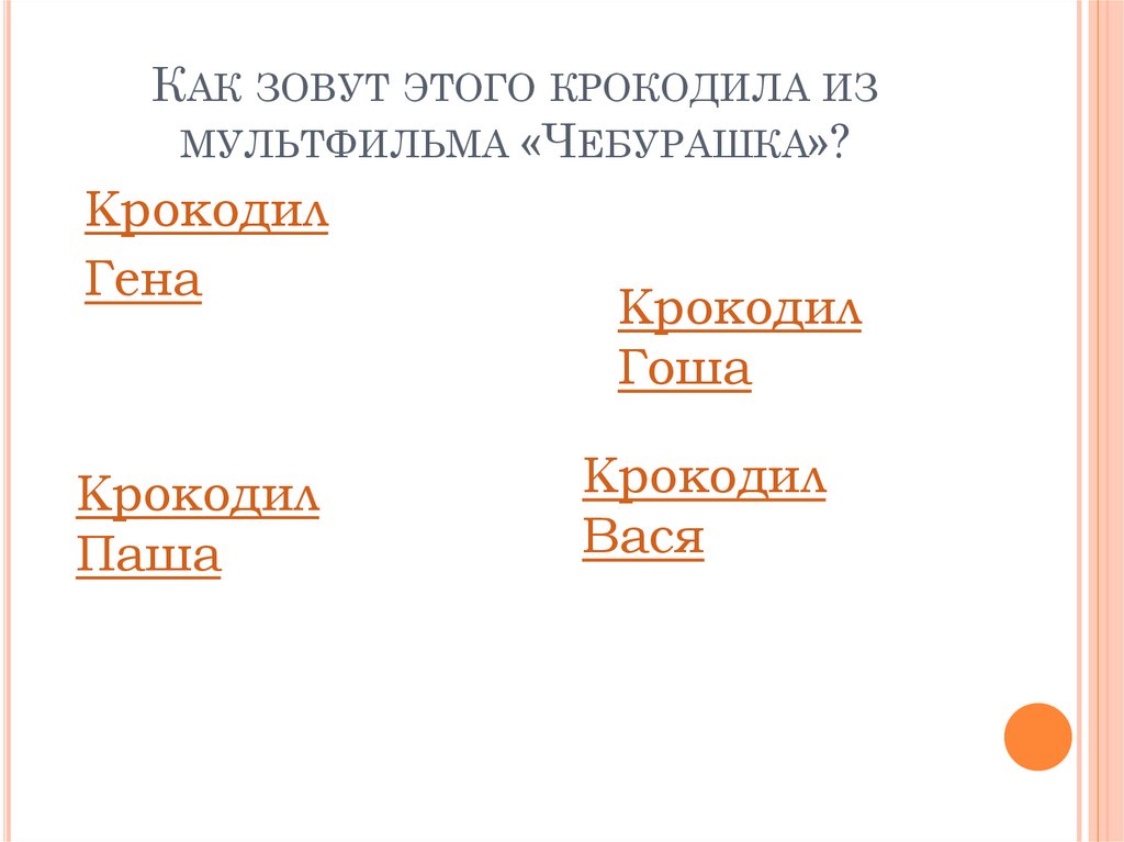 КАК ЗОВУТ ЭТОГО КРОКОДИЛА ИЗМУЛЬТФИЛЬМА «ЧЕБУРАШКА»?