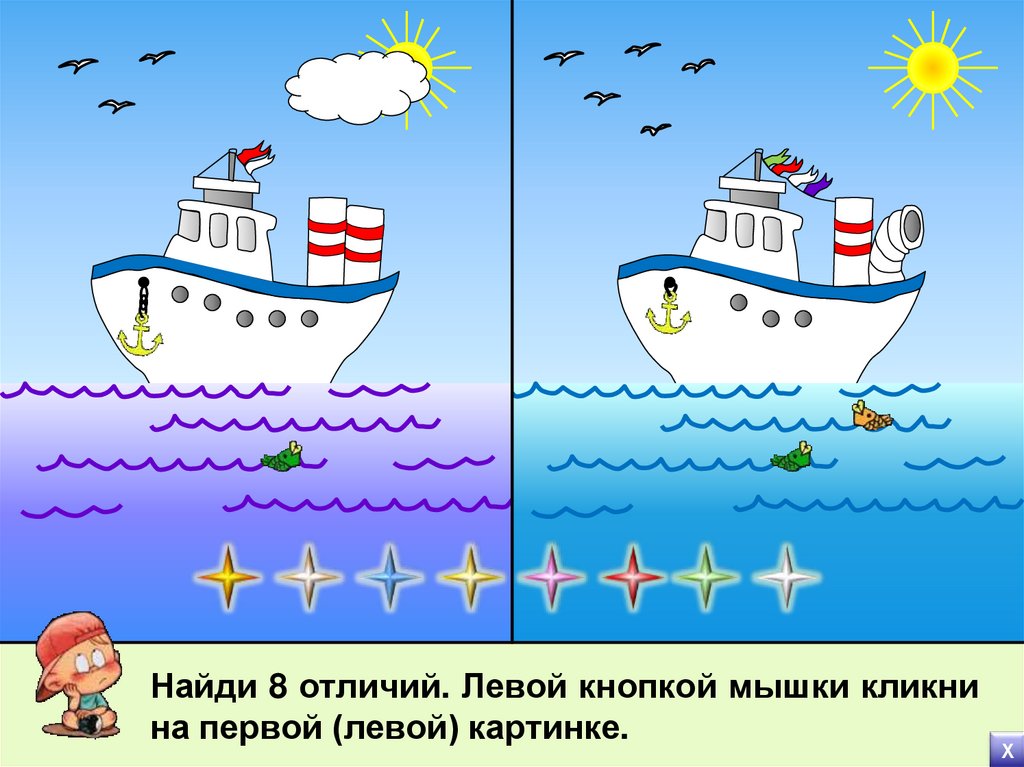 Найди 8 отличий. Левой кнопкой мышки кликнина первой (левой) картинке.