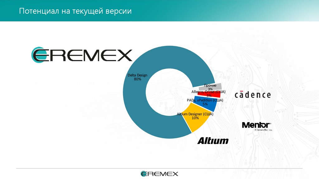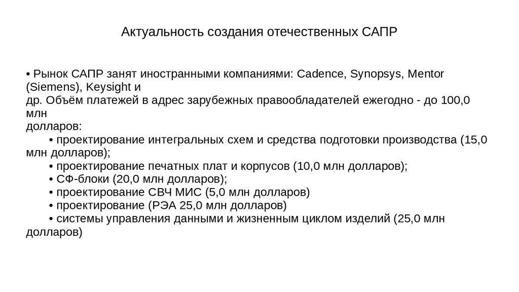 Актуальность создания отечественных САПР• Рынок САПР занят иностранными компаниями: Cadence, Synopsys, Mentor