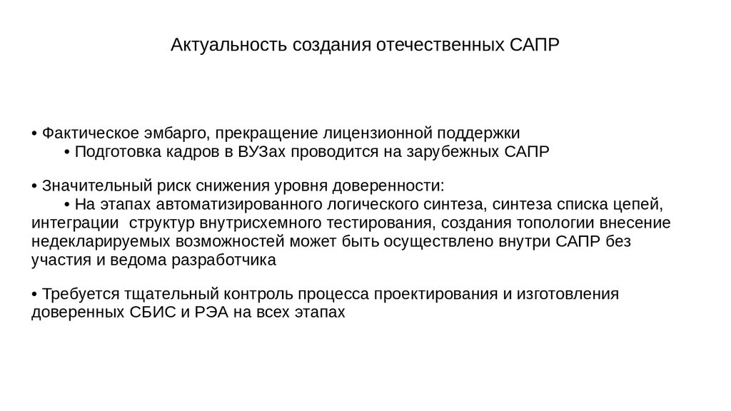 Актуальность создания отечественных САПР• Фактическое эмбарго, прекращение лицензионной поддержки