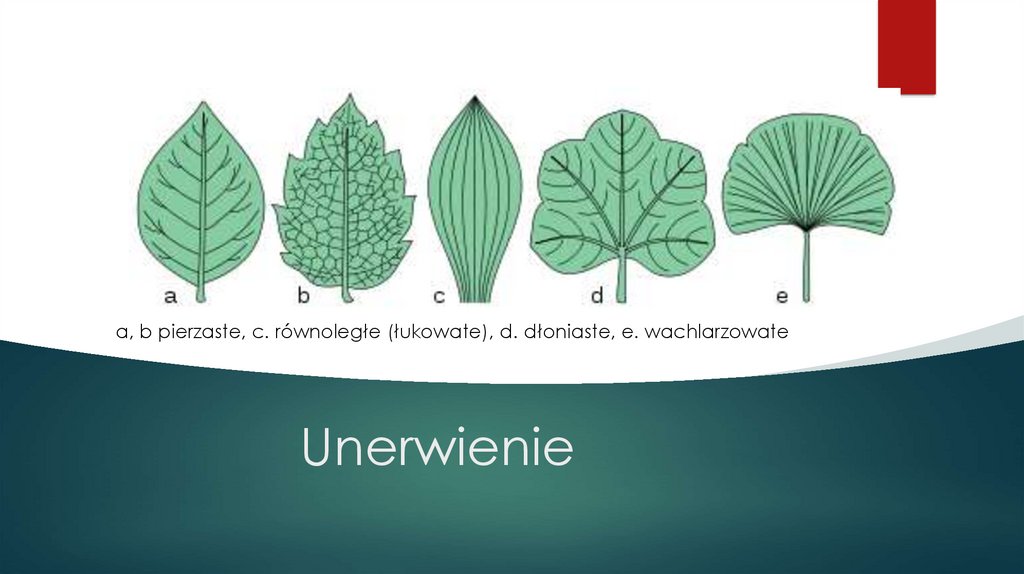 a, b pierzaste, c. równoległe (łukowate), d. dłoniaste, e. wachlarzowateUnerwienie