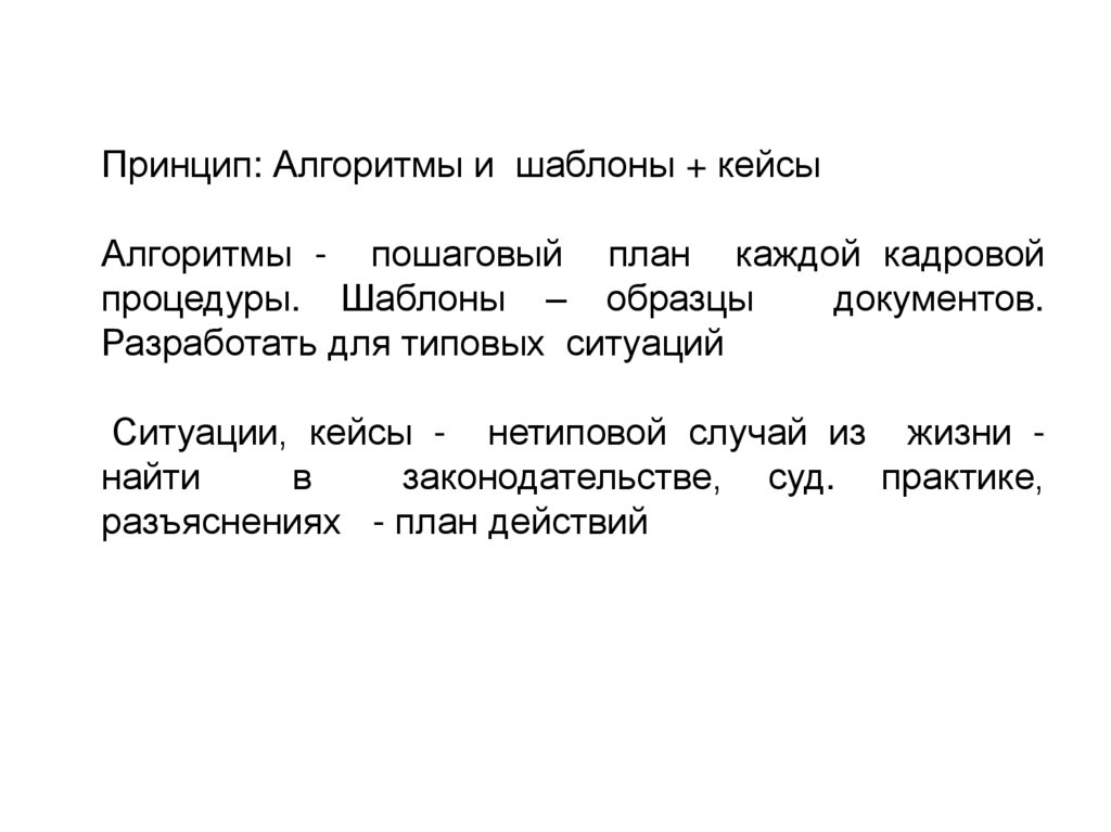 Принцип: Алгоритмы и шаблоны + кейсыАлгоритмы - пошаговый план каждой кадровой