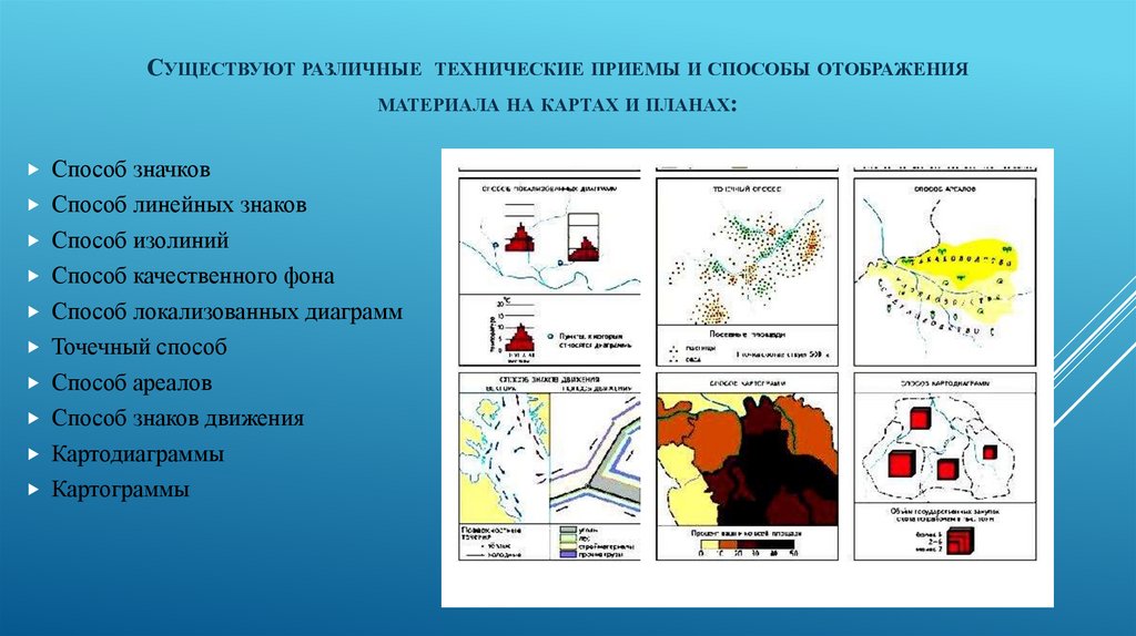 РАЗЛИЧНЫХ ТЕХНИЧЕСКИХ ПРИЕМОВ И СПОСОБОВ ОТОБРАЖЕНИЯ МАТЕРИАЛА НА КАРТАХ И ПЛАНАХ.
