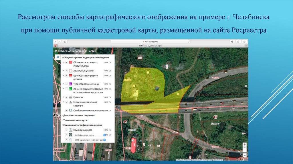 Рассмотрим способы картографического отображения на примере г. Челябинскапри помощи публичной кадастровой карты, размещенной на сайте Росреестра