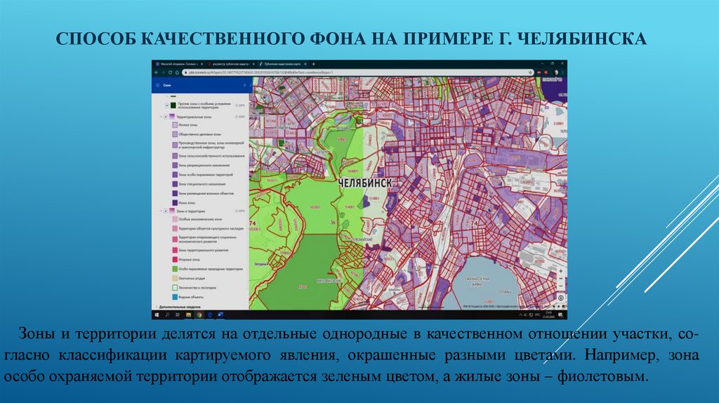 СПОСОБ КАЧЕСТВЕННОГО ФОНА НА ПРИМЕРЕ Г. ЧЕЛЯБИНСКАЗоны и территории делятся на отдельные однородные в качественном отношении участки, согласно классификации картируемого явления, окрашенные разными цветами. Например, зона