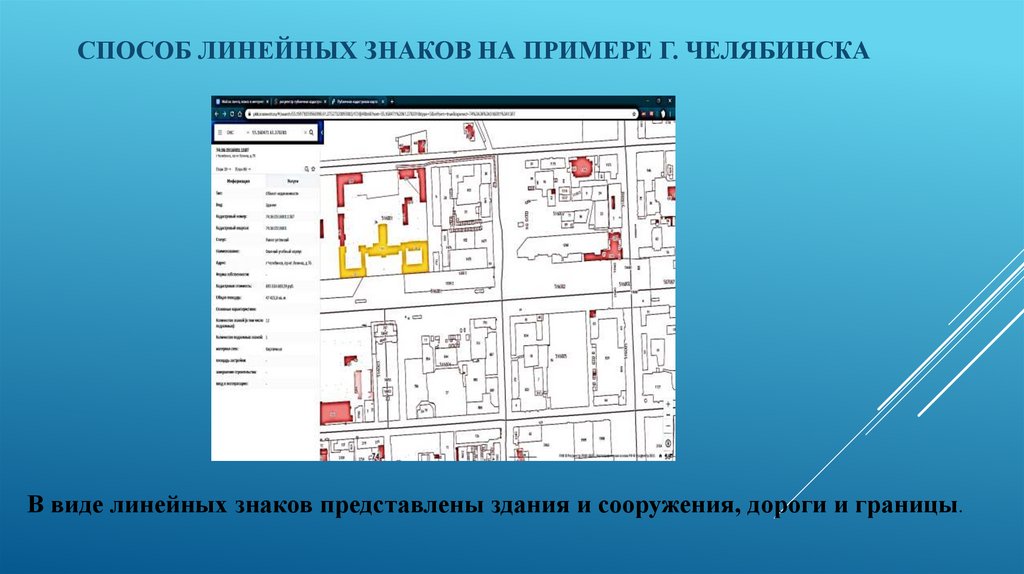 СПОСОБ ЛИНЕЙНЫХ ЗНАКОВ НА ПРИМЕРЕ Г. ЧЕЛЯБИНСКАВ виде линейных знаков представлены здания и сооружения, дороги и границы.